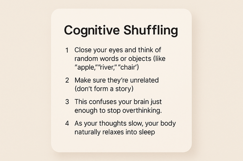 If your mind races at bedtime, cognitive shuffling may be the answer to how to sleep instantly. This method involves imagining random, unrelated words or scenes to break the cycle of stress and anxiety.