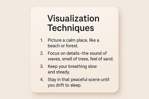 Visualisation is a powerful tool to help you relax and fall asleep quickly. By imagining peaceful scenes such as a quiet beach or a calm forest, you can reduce stress and signal to your brain that it’s time to sleep.