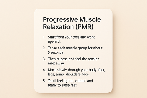 PMR involves systematically tensing and relaxing muscle groups to reduce tension. This technique can help you sleep fast and prepare your body for a deeper rest.